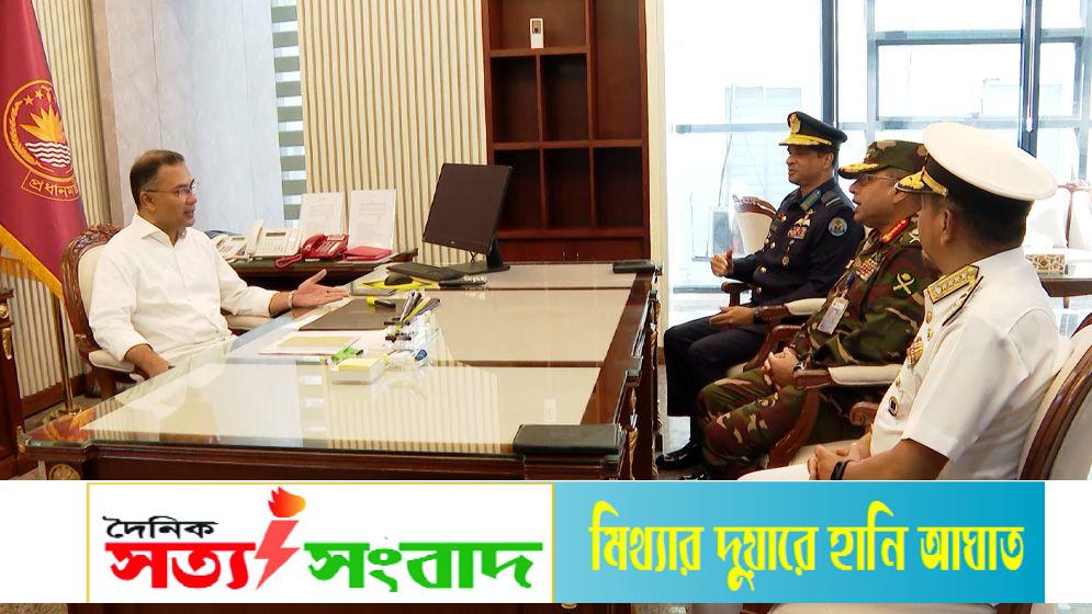 বৃহস্পতিবার (১৯ ফেব্রুয়ারি) সকালে তিনি তিন বাহিনী প্রধানের সঙ্গে বৈঠক করেন। উপস্থিত ছিলেন সেনাপ্রধান জেনারেল ওয়াকার-উজ-জামান, এয়ার চিফ মার্শাল হাসান মাহমুদ খাঁন, ও নৌবাহিনী প্রধান ভাইস অ্যাডমিরাল মোহাম্মদ নাজমুল হাসান।