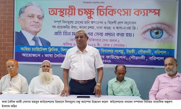 গৌরনদী প্রতিনিধি // ৫২‘র ভাষা আন্দোলনের সর্বদলীয় রাষ্ট্রভাষা সংগ্রাম পরিষদের আহবায়ক ভাষা সৈনিক কাজী গোলাম মাহবুব ফাউÐেশন ও ট্রষ্ট্রের উদ্যোগে টরকী নীলখোলা আসিয়া চ্যারিটেবল কমপ্লেক্সে সোমবার আই ক্যাম্পের উদ্ধোধন করা হয়। ক্যাম্পের উদ্ধোধন করেন প্রধান অতিথি ভাষা সৈনিক কাজী গোলাম মাহবুব ফাউÐেশনের সাধারন সম্পাদক ও গৌরনদী বিআরডিবির সাবেক চেয়ারম্যান সিনিয়র সাংবাদিক জহুরুল ইসলাম জহির। ক্যাম্পের মাধ্যমে হতদরিদ্র মানুষের জন্য বিনা মূল্যে চক্ষু চিকিৎসা, চোখের সানি, নেত্রনালী অপারেশন, বিনামূল্যে চশমা ও ঔষাধ সরবারহ করা হয়। আই ক্যাম্প প্রকল্প ক্যাম্প অর্গানাইজার কাজী মিজানুর রহমানের সভাপতিত্বে উদ্ধোধনী অনুষ্ঠানে প্রধান অতিথি ছিলেন ভাষা সৈনিক কাজী গোলাম মাহবুব ফাউÐেশনের সাধারন সম্পাদক ও গৌরনদী বিআরডিবির সাবেক চেয়ারম্যান সিনিয়র সাংবাদিক জহুরুল ইসলাম জহির। বিশেষ অতিথি ছিলেন বিশিষ্ট সমাজসেবক মোঃ সেলিম হাওলাদার, সাংবাদিক সোলায়মান তুহিন, মোঃ সফিকুর রহমান সফিক। চিকিৎসা সেবা প্রদান করেন ইস্পাহানি ইসলামিয়া চক্ষ হাসপাতালের চক্ষু চিকিৎসক ডাঃ বেনজীর বুশরা, কাউন্সিলর ছিলেন তানিয়া আক্তার, খাদিজা আক্তার, সুমী আক্তার, সাইদুর রহমান শাওন হোসেন। বক্তব্য রাখেন ভাষা সৈনিক কাজী গোলাম মাহবুব ফাউÐেশনের তদারককারী মো. মোফাজ্জেল হোসেন। উল্লেখ্য ভাষা সৈনিক কাজী গোলাম মাহবুব ফাউÐেশন ও ট্রষ্ট্রের উদ্যোগে টরকী নীলখোলা আসিয়া চ্যারিটেবল কমপ্লেক্সে প্রতি তিন মান অন্তর এ সেবা ক্যামেপর আয়োজন করা হয়। এ ছাড়া প্রতি সপ্তাহের শনিবার ও বুধবার বিশেষজ্ঞ চিকিৎসক দ্বারা বিনা পয়সার হতদরিদ্র মানুষকে স্বাস্থ্য সেবা প্রদান করা হয়।